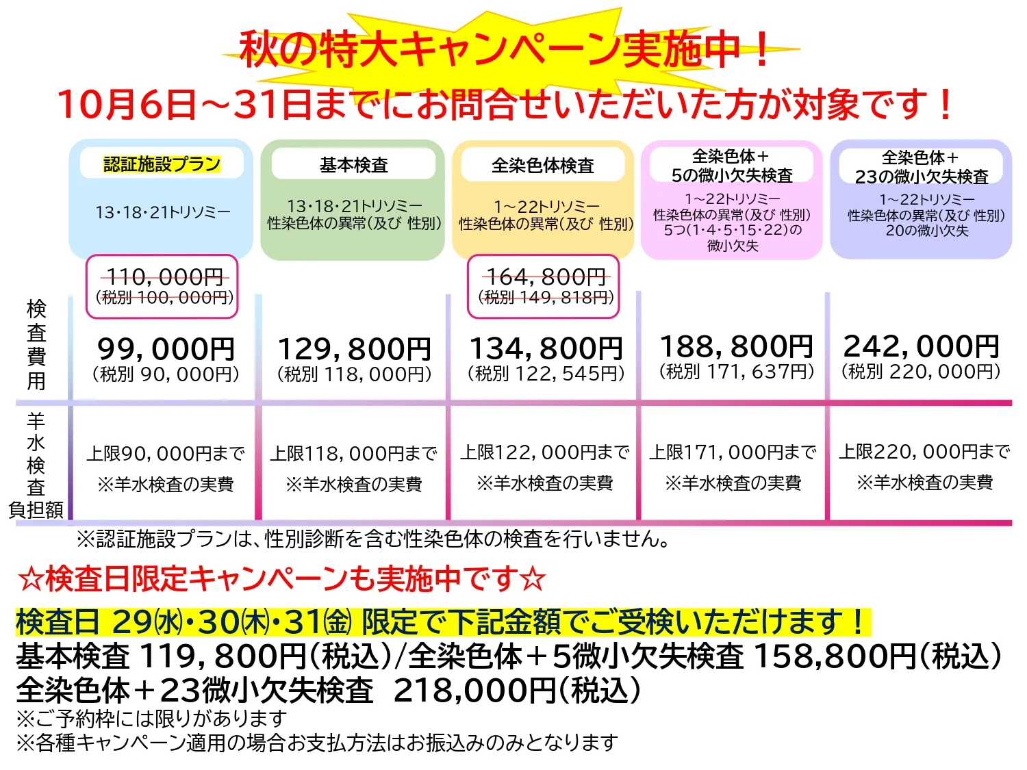 全染色体検査:税込164,800円(税別149,818円)、全染色体+5微小欠失検査:税込188,800円(税別171,637円)、
